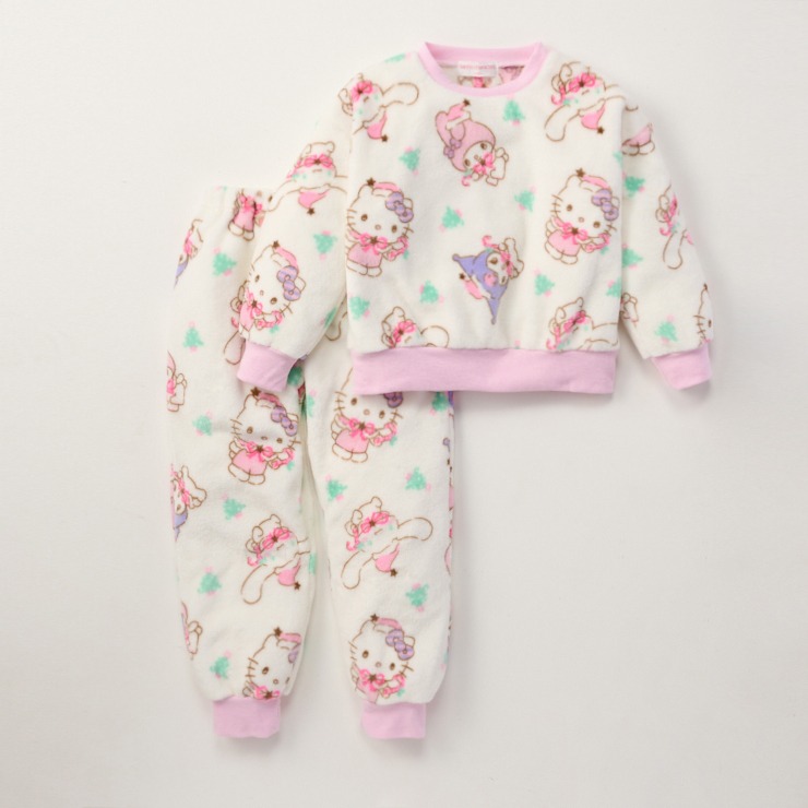 フリースあったか素材にハローキティ・マイメロディ・クロミ・シナモロール4キャラクターの総柄プリントした上着と総柄ロングパンツです。