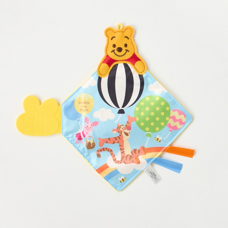 "かわいいハチの歯固めが付いた、くまのプーさんのパリパリ入り布おもちゃです。