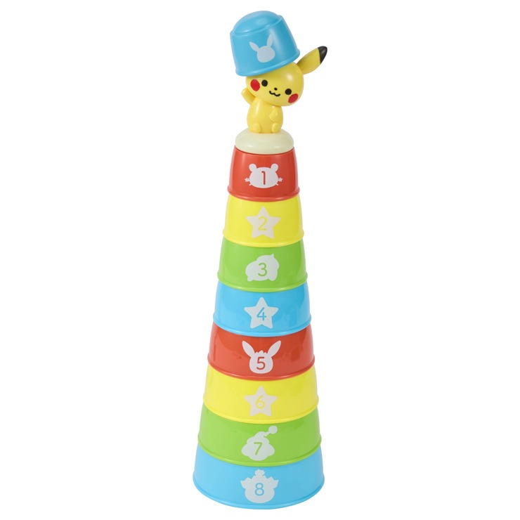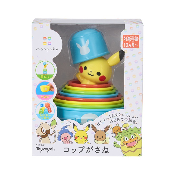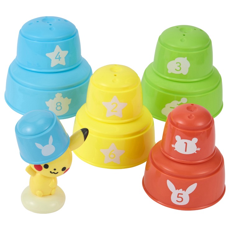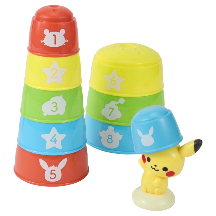 ピカチュウたちといっっしょにはじめての知育あそび。おすわりの頃からの定番のコップがさねは、「重ねる」「水あそび」といった遊びに「色」「数字」のお勉強ができます。