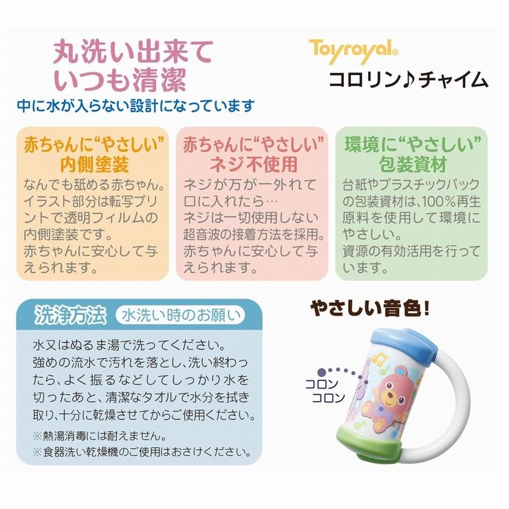 なんでも舐める赤ちゃんに水洗い可能な洗えるラトルシリーズが新登場!無塗装、ネジ不使用、再生包装資材仕様のシリーズです。コロリンチャイムは、やさしい音色で軽くてにぎりやすいラトルです。
