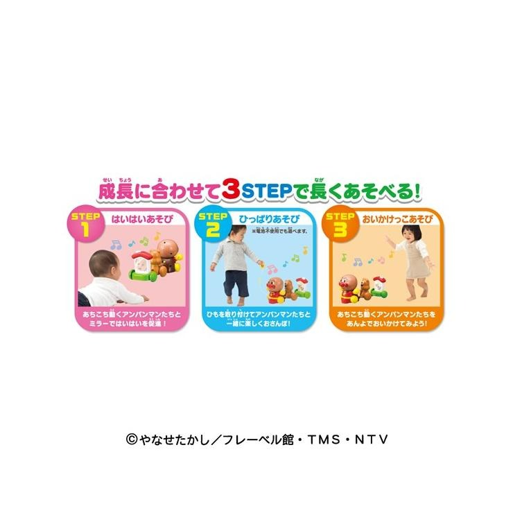 ◎メロディ走行中はアンパンマンが「1・2!1・2!」「頑張れ頑張れ!」などとお子様のはいはいやあんよを促してくれるおしゃべりが流れます。