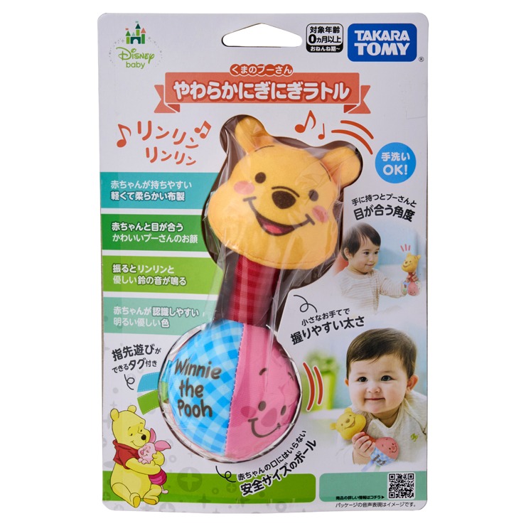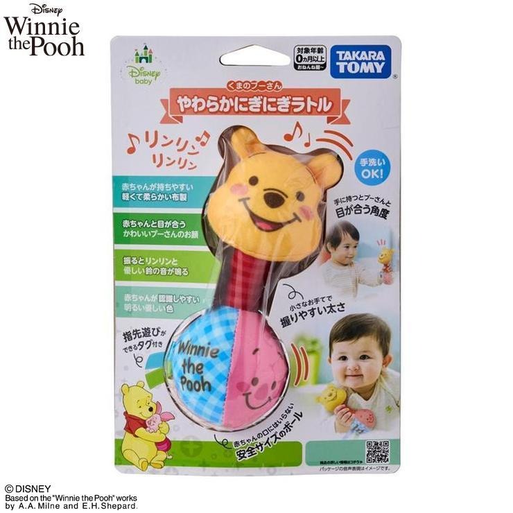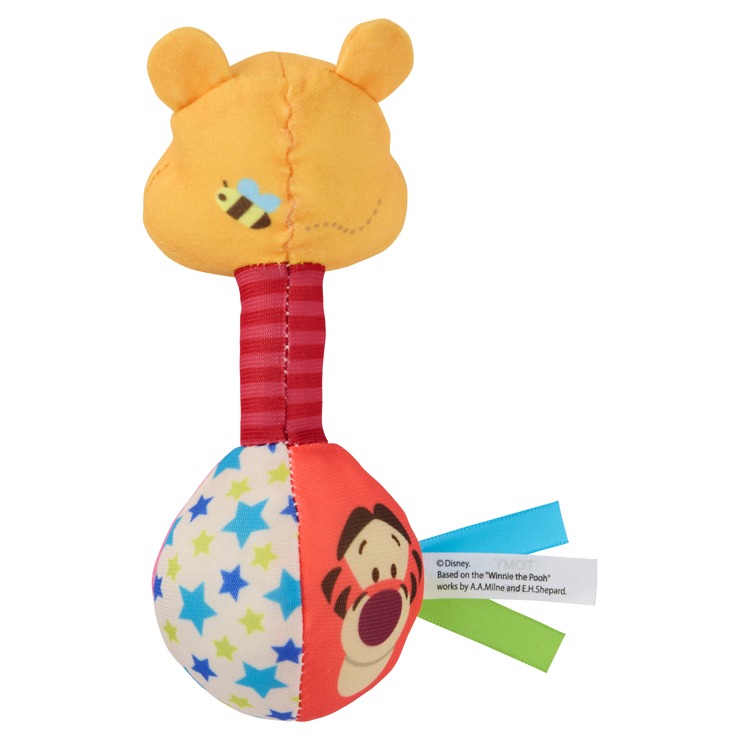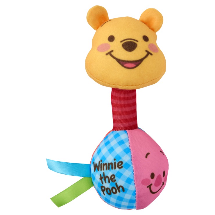 軽くて持ちやすい、やさしい音色がするくまのプーさんの鈴入りラトル。