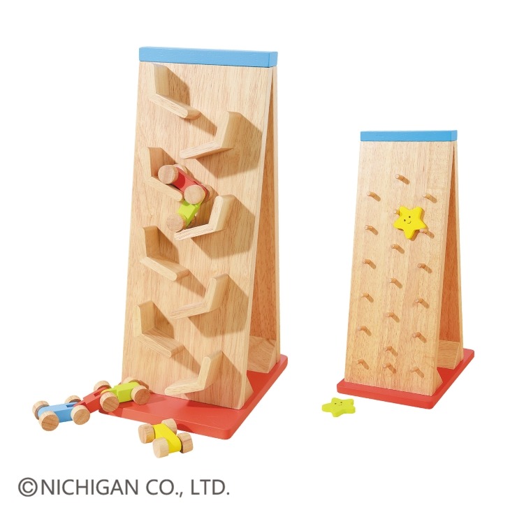 3種類の車はスピーディに、2色の星は左右に揺れながらスロープを滑り落ちます。