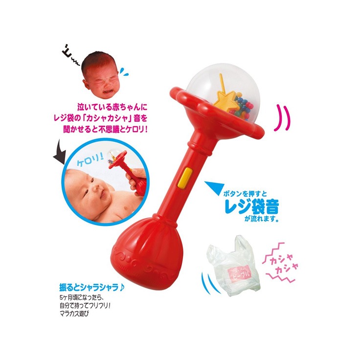 0ヶ月、産院から帰ったその日から!泣いている赤ちゃんにレジ袋の「カシャカシャ」音を聞かせると、不思議とケロリ!ボタンを押すとレジ袋音が流れます。振るとシャラシャラ♪5か月頃になったら、自分で持ってフリフリ!マラカス遊び!