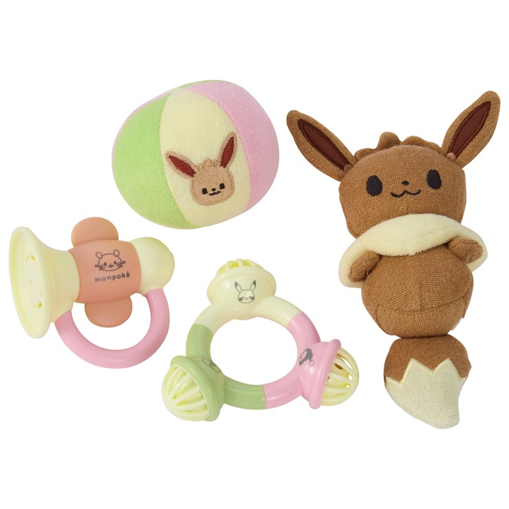 生まれて最初のパートナーに!モンポケのかわいいラトルセットイーブイ。成長に必要な遊びが出来る商品のセットです。「イーブイのぬいぐるみ」触覚的な刺激を・・にぎにぎやさしい布製のぬいぐるみ「リンリン」聴覚的な刺激を・・振ると三つの鈴がリンリン。「ホイッスル」口腔内への刺激を・・吹くとピュ?っと音が鳴る。「やわらかボール」視覚的な刺激を・・やさしいパイル地のボール。●丸洗い出来ていつでも清潔に!ラトルはすべて簡単に丸洗いができます。いつも清潔に保ってママと赤ちゃんも安心です。