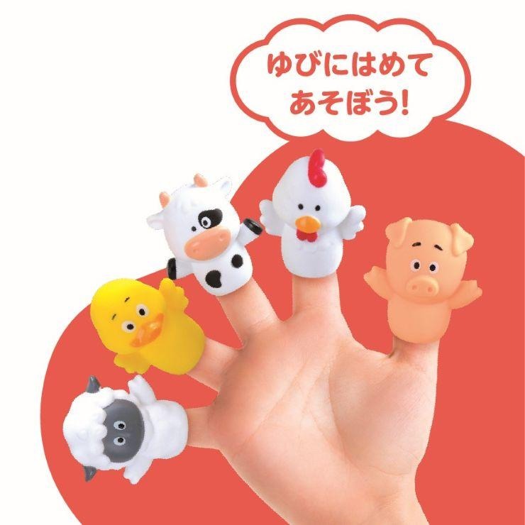 「ゆびにんぎょう ファーム」は、牛・ひつじ・ぶた・にわとり・アヒルが指先にぴったりフィットする、やわらか素材のフィンガーパペット。