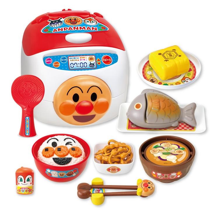 - すいはんき、立つしゃもじ、ちゃわん、おわん、おみそしるプレート、おはしのアンパンマン、おはしおき:ABS/おはし、こばち、丸いお皿、四角いお皿:PP/アンパンマンごはん、たまごやき、焼きざかなトントン、ドキンちゃんふりかけ:PS/おはしの先:TPE/なっとう:EVA/スポイト:PE