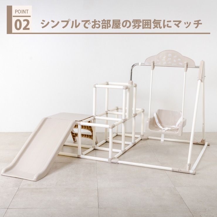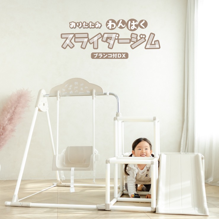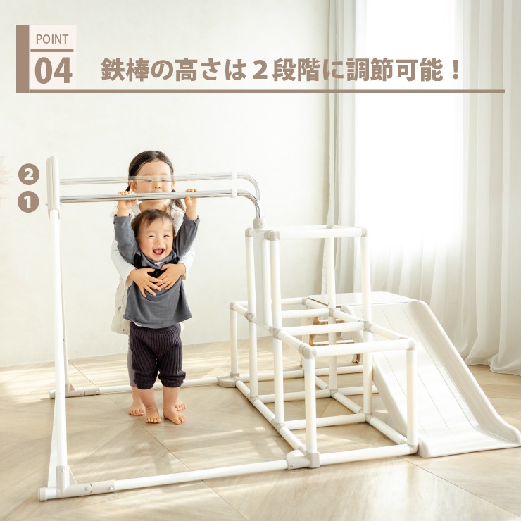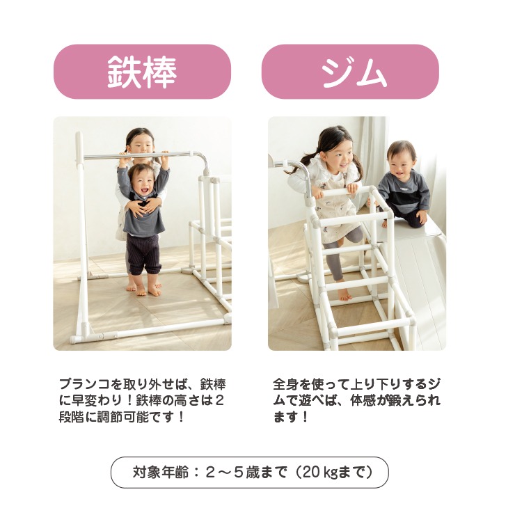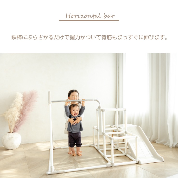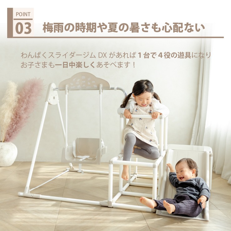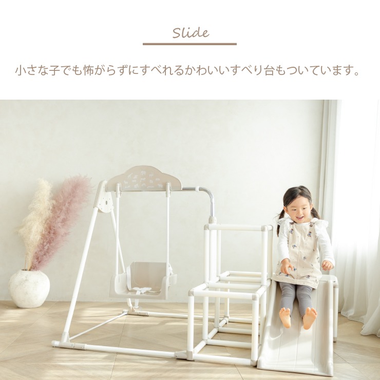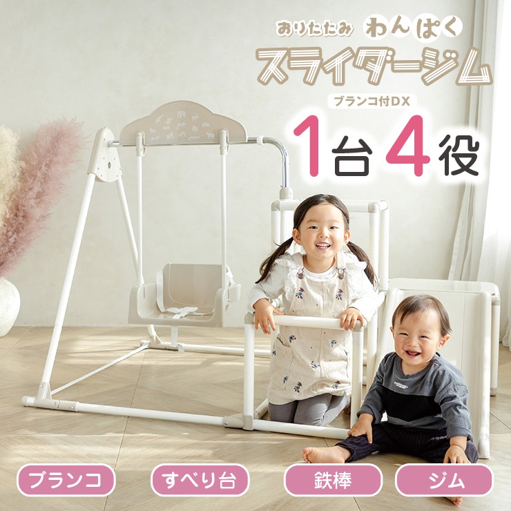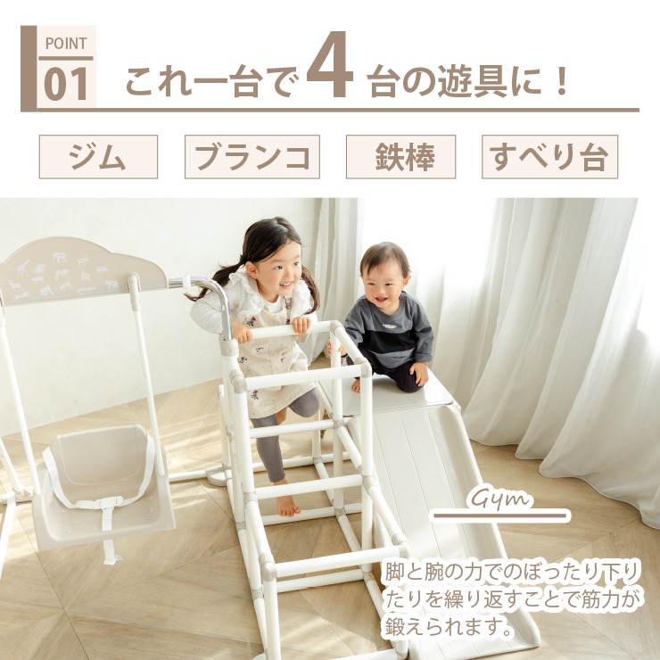 1台でジム、ブランコ、鉄棒、すべり台4つの遊具として遊べます。