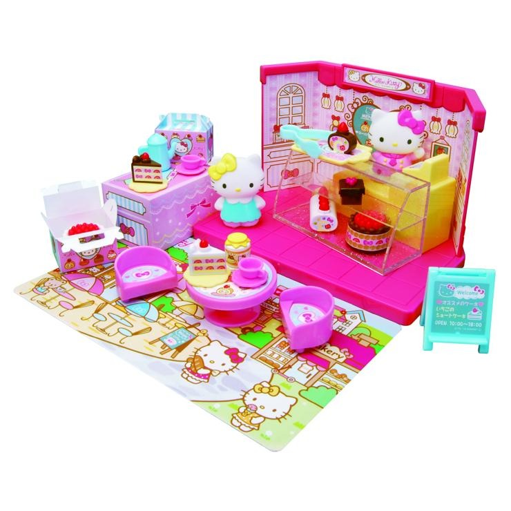 ・キティとミミィのフィギュア、ホールケーキやカットケーキなどスイーツが入ったケーキ屋さんごっこで遊べるセットです。