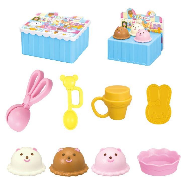 ケースをひっくり返して、かわいい くまさんのアイスを並べればおみせやさんに♪ ディッシャーでアイスをとって、コーンやカップにもりつけて遊べます。 スプーンやコーンはメルちゃんたちが持つことができます。