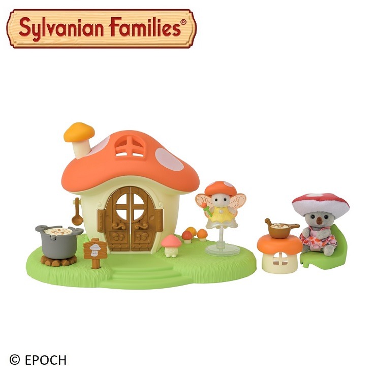 畑できのこを収穫したら、妖精さんが魔法のシチューを作ってくれるよ!大きなきのこや、葉っぱのいすも付いています。