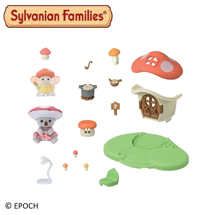 きのこの妖精ときのこのお家、家具、赤ちゃん、おともだちのセットです。