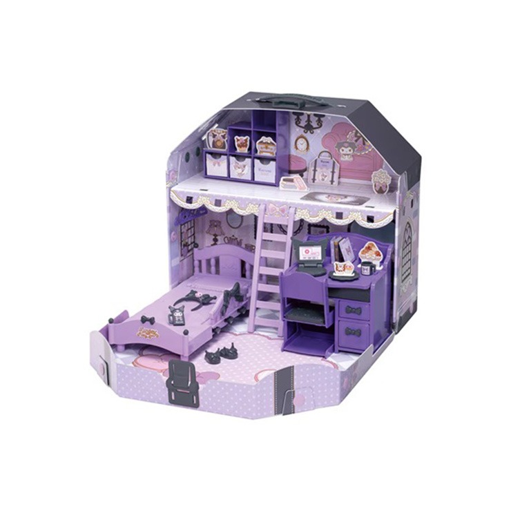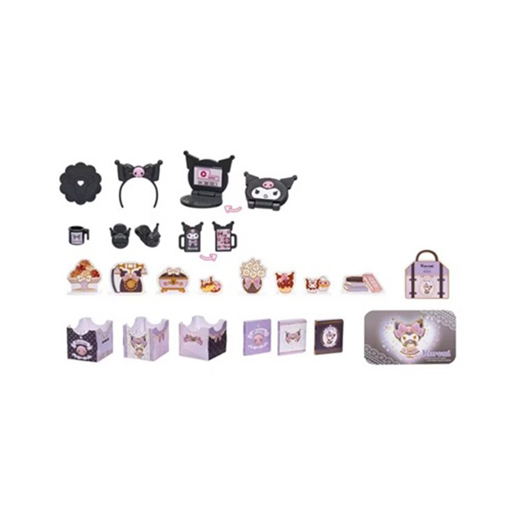 すてきな家具とあこがれのロフト、クロミの小物(パソコン、スマホ、カチューシャ、スリッパ、お皿、カップ)や紙小物が付いています。