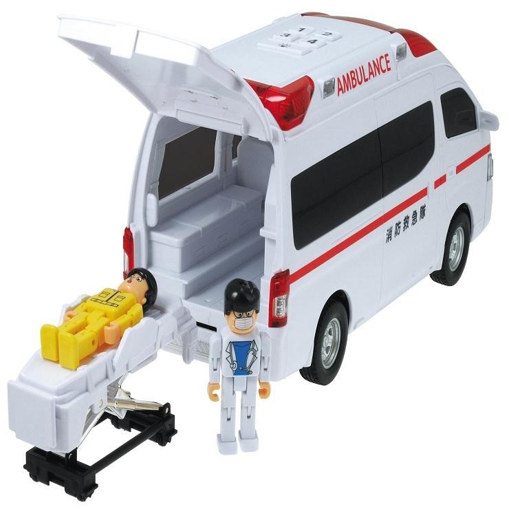 ●リアルに再現した救急車 ! ●フリクション走行 ●電源ON-OFFスイッチ ●リアルサウンド ●音量調節ボタン (2段階) ●後部ドア開閉 ●警告灯点滅 (正面・上部) ●室内灯点滅 【自動OFF機能付(約3分)】 ●人形2体 ・ストレッチャー付