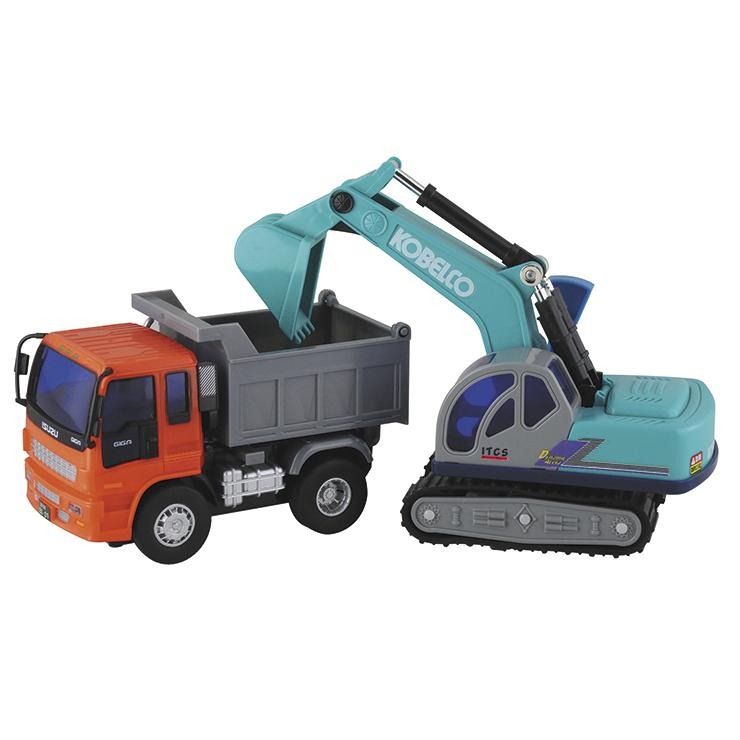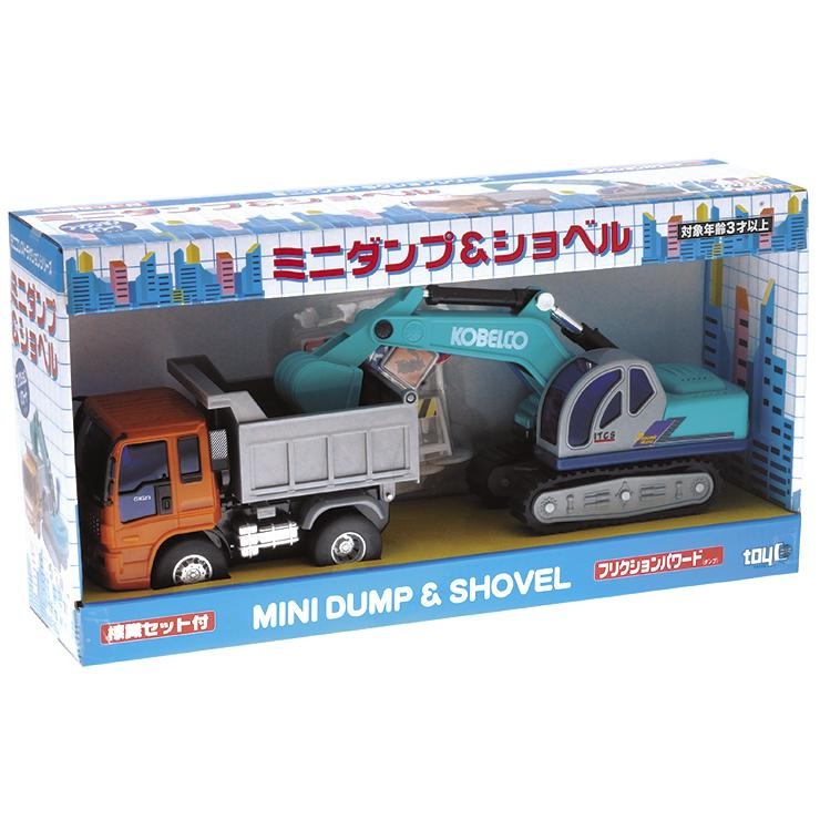 【はたらくくるま】 ● (ダンプ) フリクション走行 ● (ダンプ) ボタンを押すと荷台が上昇 ● (ショベル) ころがし走行 ● (ショベル) レバー操作でアーム可動 ● 標識セット付