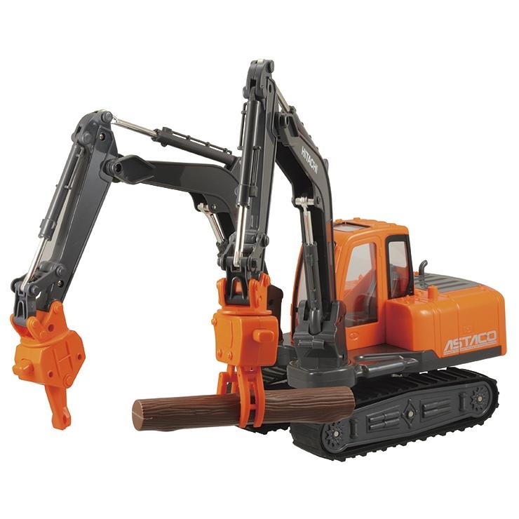 【はたらくくるま】 ● ころがし走行 ● アームが自由に動く(手動) ● キャビン回転 ● ボタン操作でグラップル・カッター開閉 ● 丸太3本付