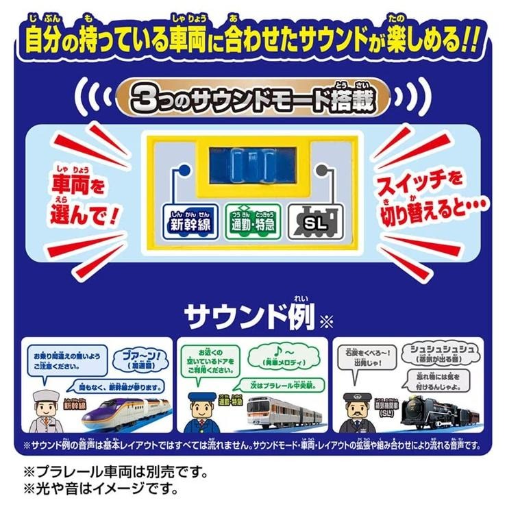プラレールとトミカが一緒に遊べる大きな踏切、ぐるっとカンカン踏切が登場! レバーとボタンでプラレールとトミカをコントロール! 光と90種類以上のリアルなサウンドで列車がくるワクワク感が楽しめる! 車種に合わせて切り替えられる3つのサウンドモードや、さらにサウンドをオフにして遊べるモードも搭載!