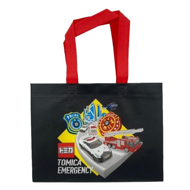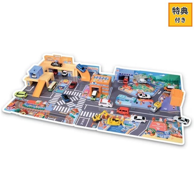 バッグを開くと大きな街が出現!13個の各種スイッチを押して、パトカーなど色々な車や信号ふみきりなど様々な街の音を出し、トミカを使ってマップの道路建物で遊びましょう!マンションのガレージからトミカを出庫すると、色々な行先や出来事のおしゃべりが発声!左右から閉じるだけの簡単おかたずけ仕様です。 ※トランプなど特典付きです。 ※特典は一部アソートにより柄はお選びいただけません。 © TOMY
