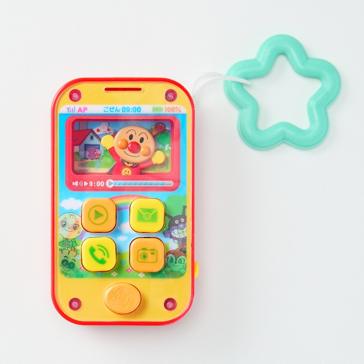 アイコン風のボタンを押すとアンパンマンと電話ができたり、シャッター音が出るなど簡単に遊べるスマホです。