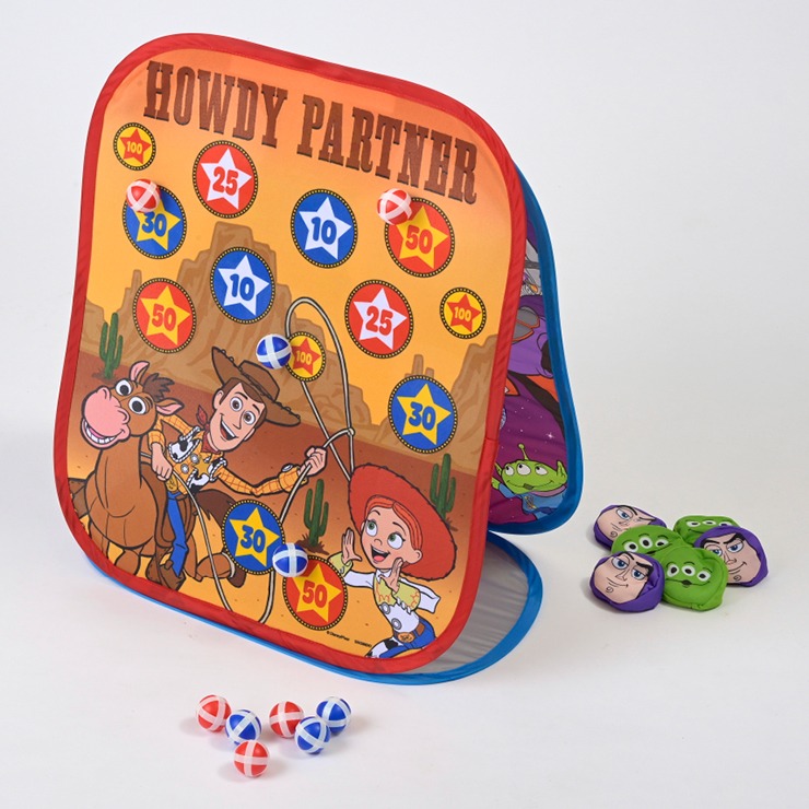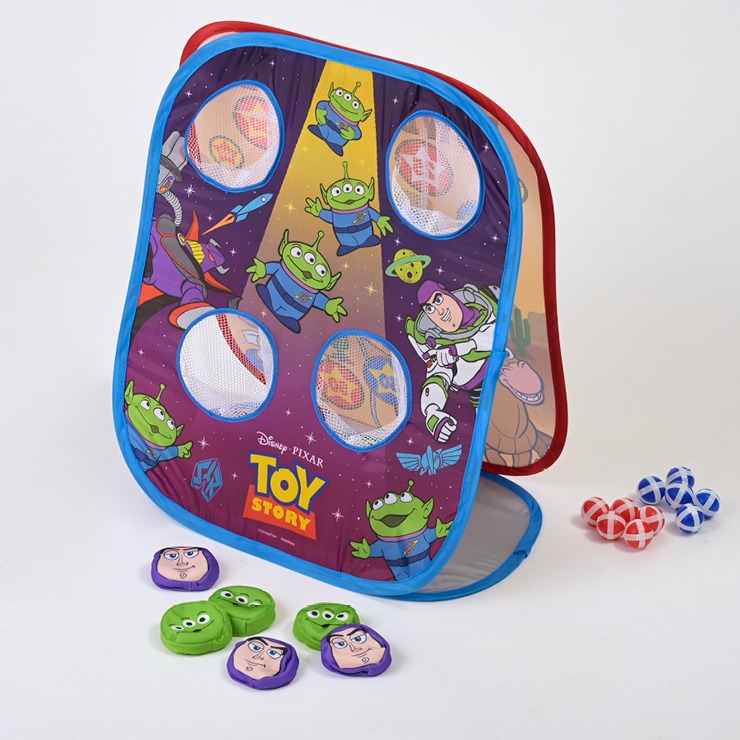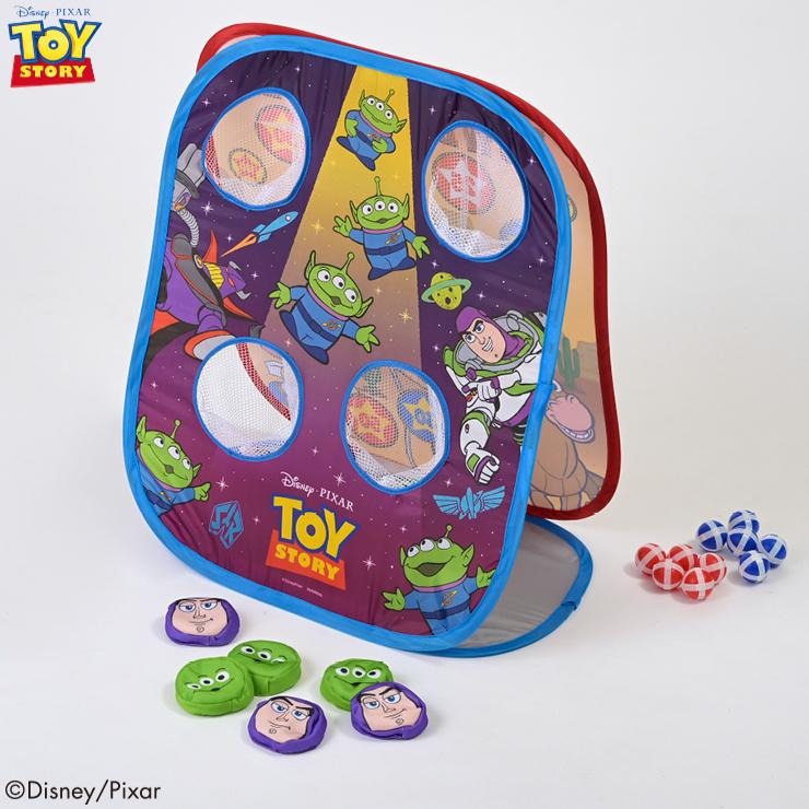組み立ては簡単!使わない時は付属の収納袋に簡単に収納出来ます。的当て用ボール2色x各4個と、ボール投げ用お手玉ボールが2柄各4個付いています。