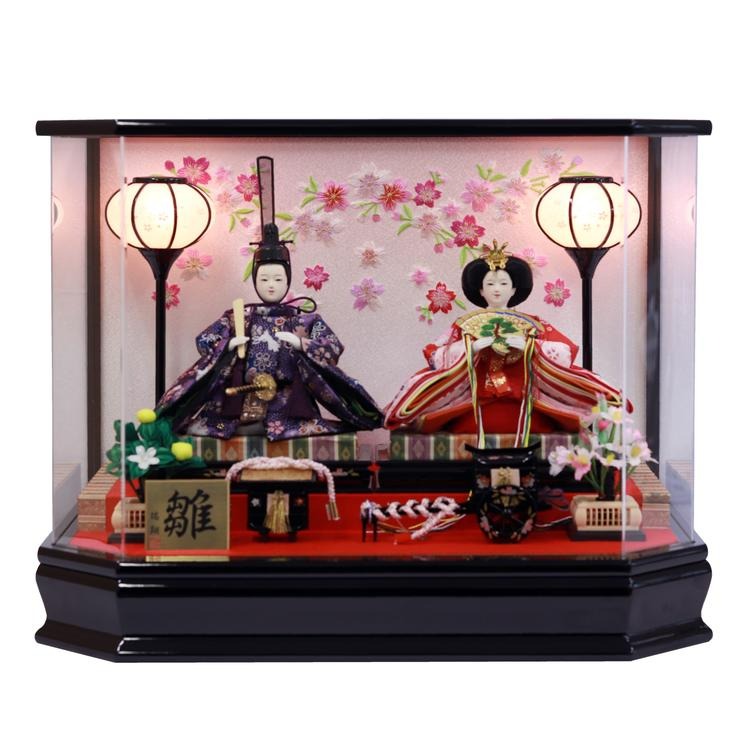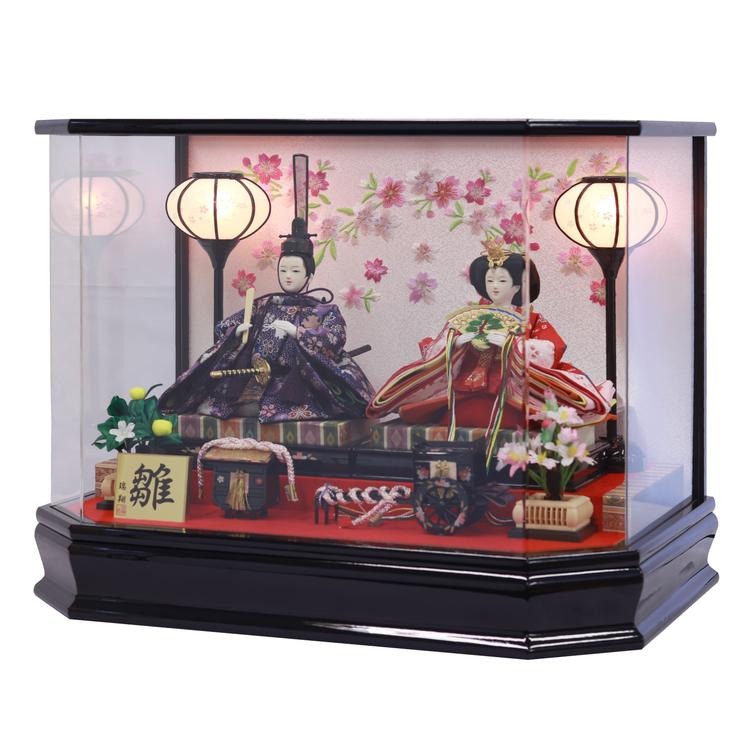 前面の柱を取り払ったモダンな黒塗りの六角ケースは、お人形が美しく映える、広がりのあるつくりが魅力です。