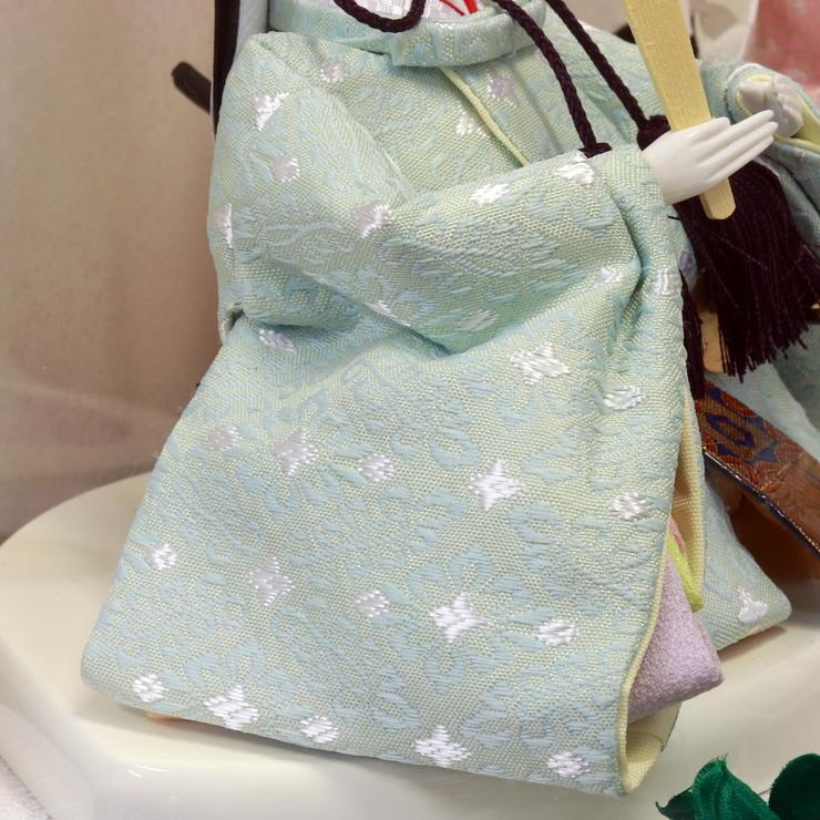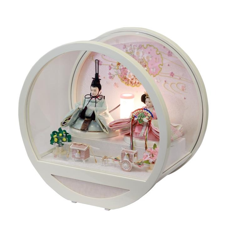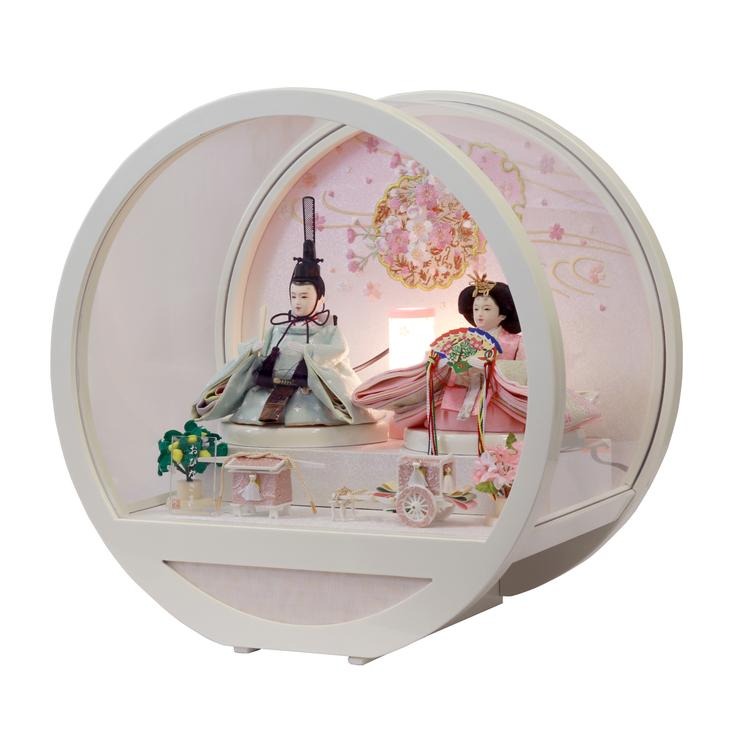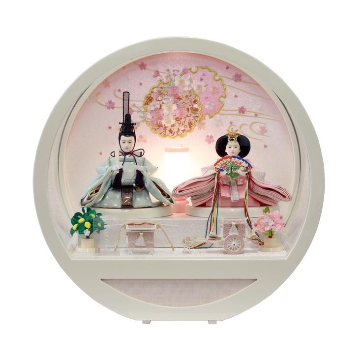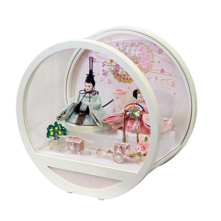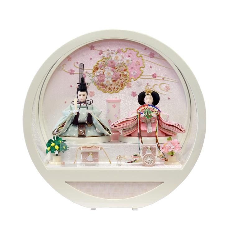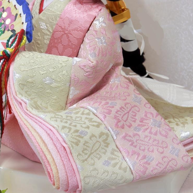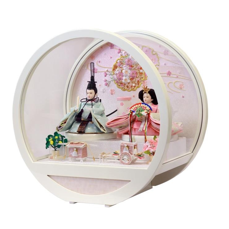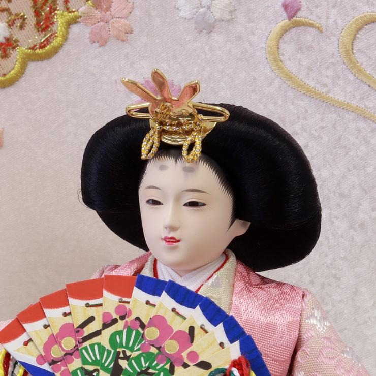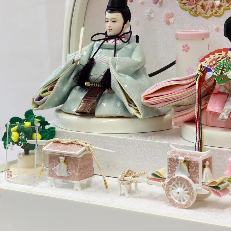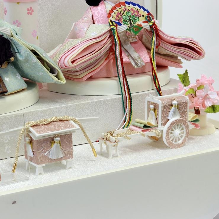 前飾りには、可愛らしいピンクのお駕籠(かご)と御所車(ごしょぐるま)を揃えました。
