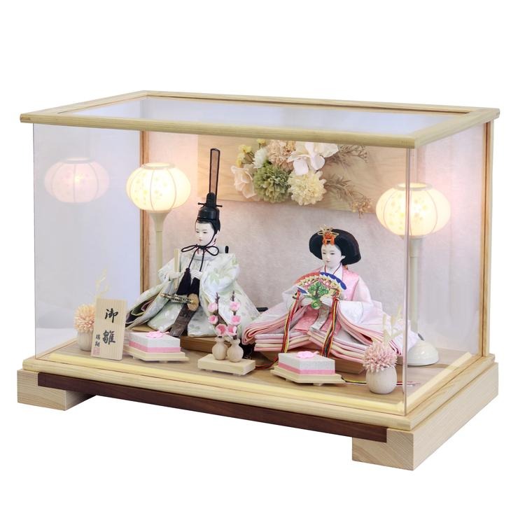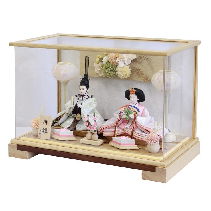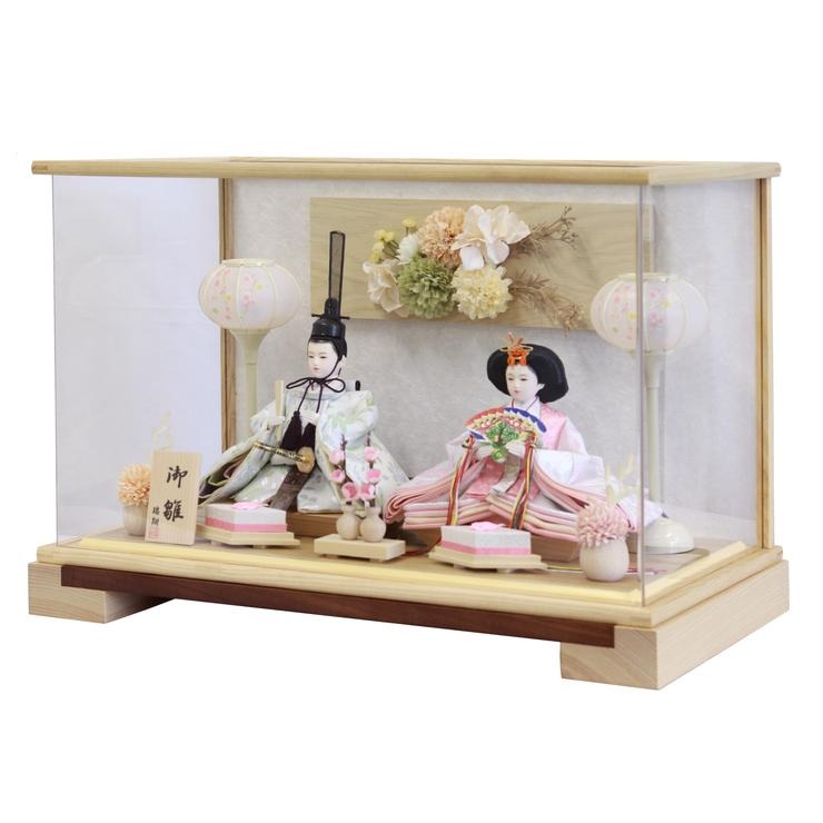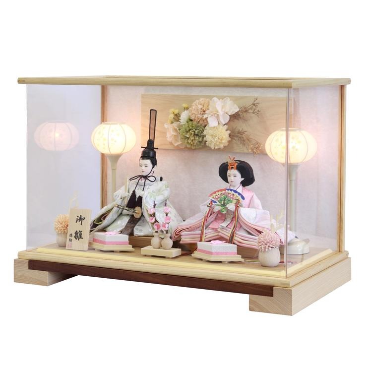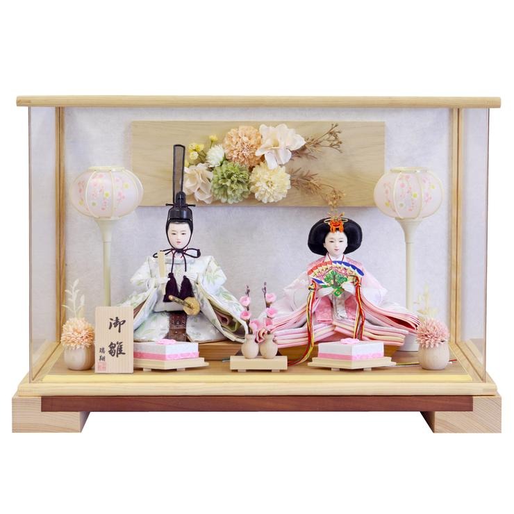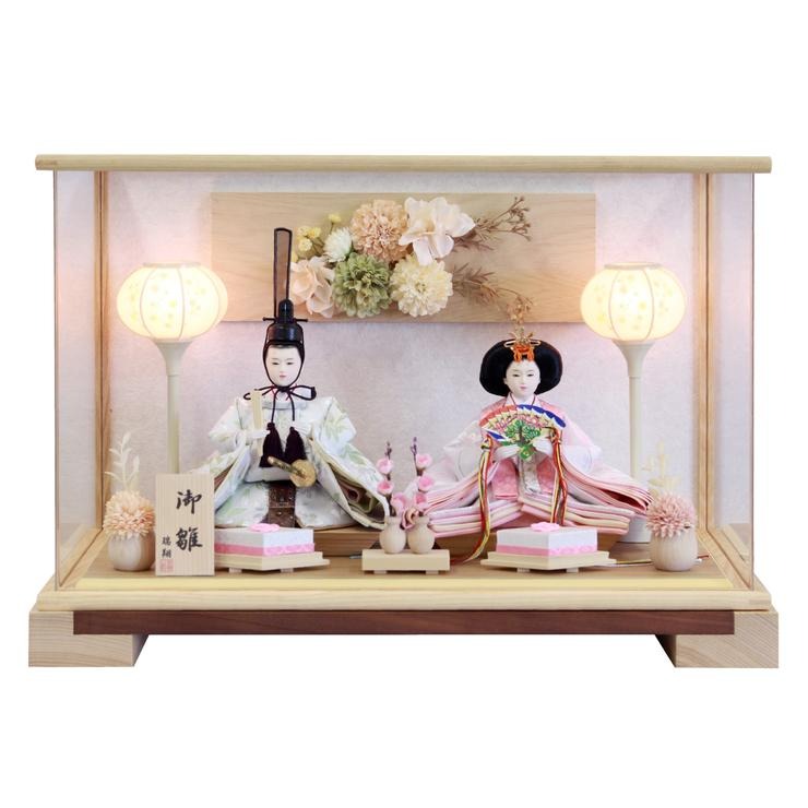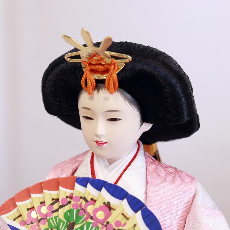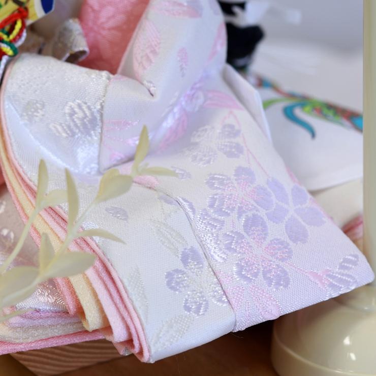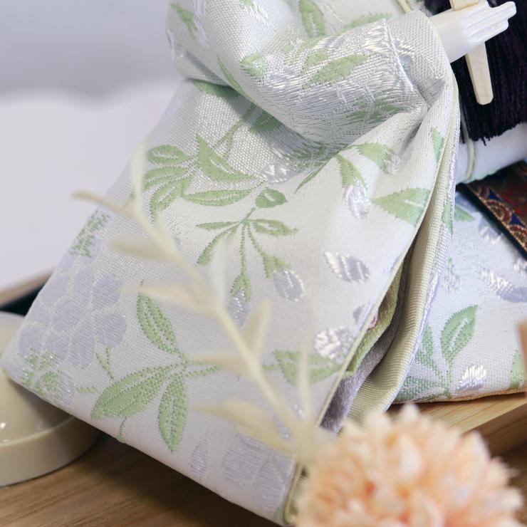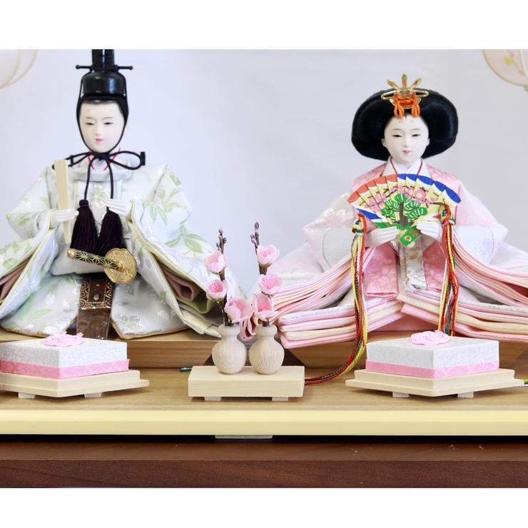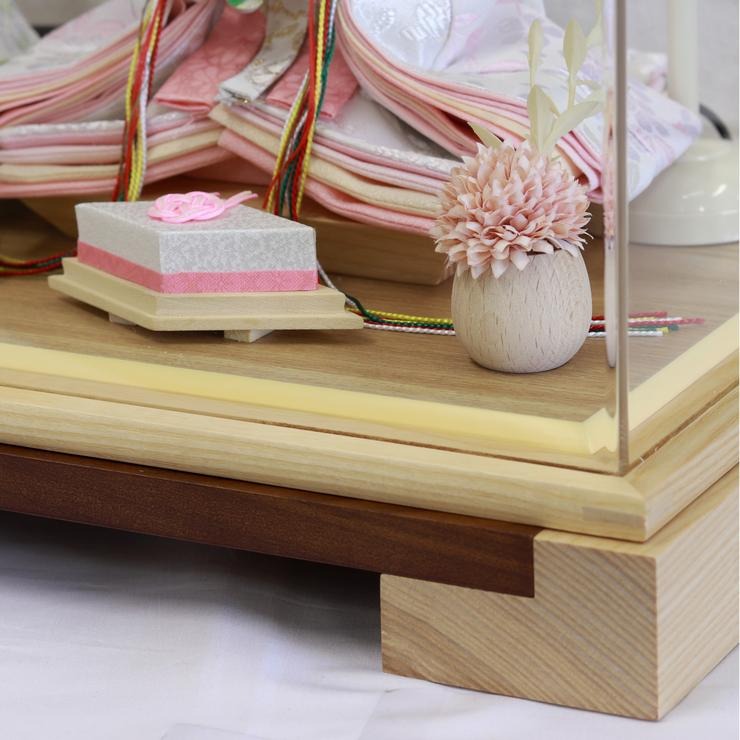 お人形の前に飾るお道具やお花も、全体の世界観に合わせてナチュラルな白木調で統一しています。