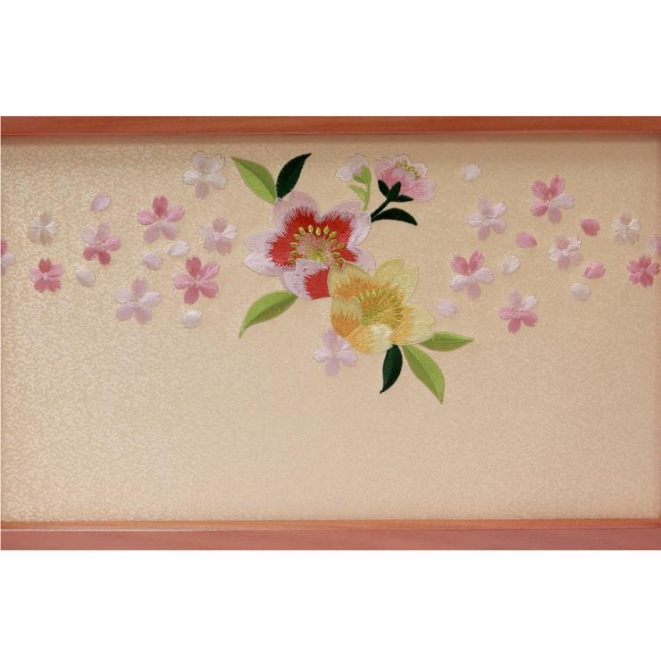 お飾り台となる箱の幕板や屏風には、色鮮やかな大小の桜の刺繍を贅沢に散りばめました。