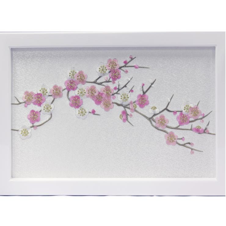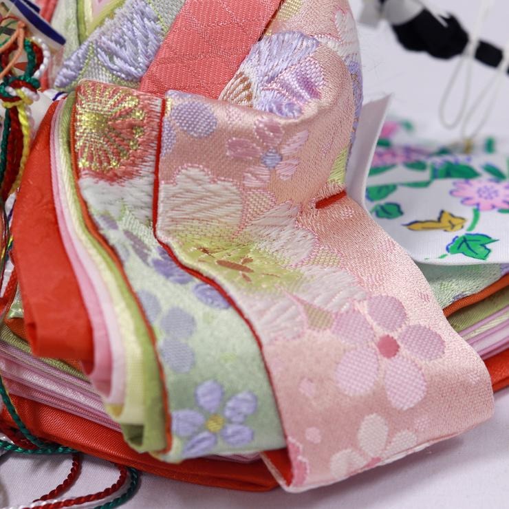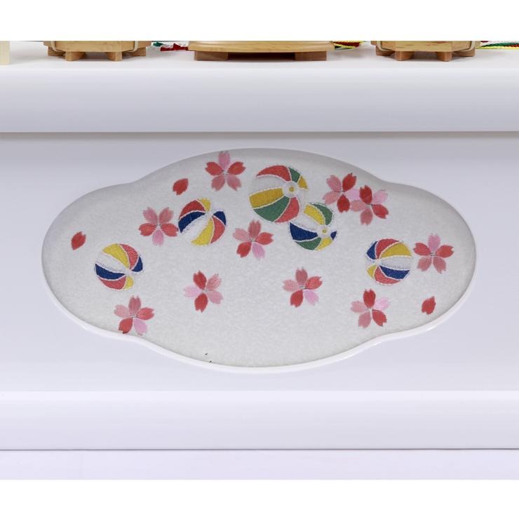 飾り台となる箱のデザインも魅力の一つ。屏風には上品な梅の刺繍を、そして幕板には色とりどりの鞠や小花を愛らしく散りばめました。