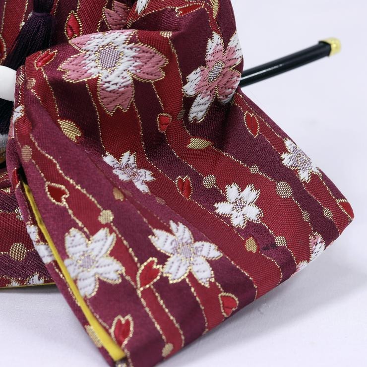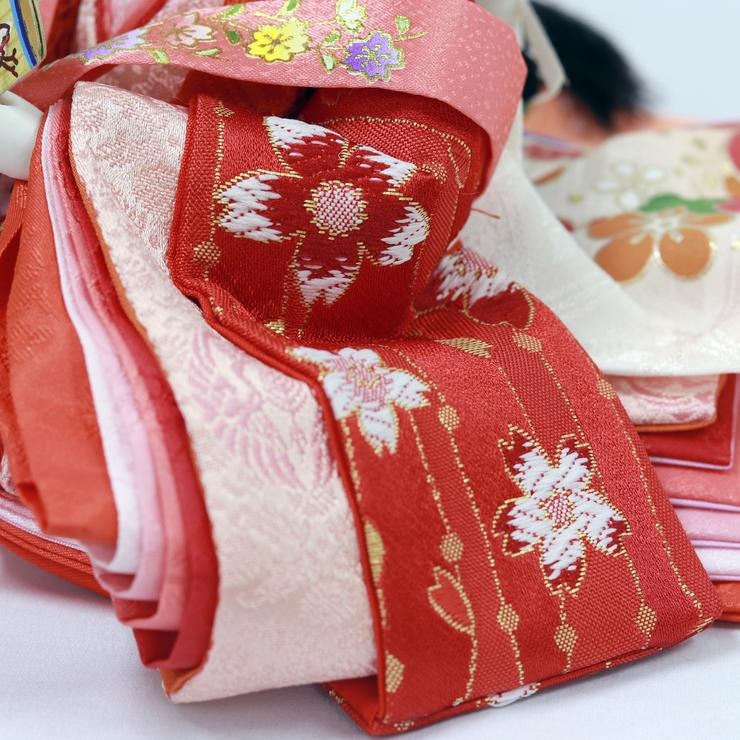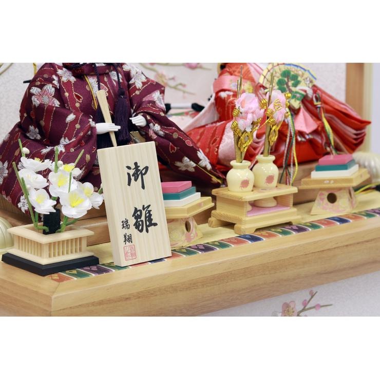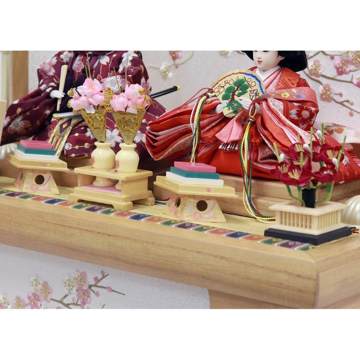 お人形の衣裳は可憐な花柄で、前飾りのお道具はナチュラルな白木。全体が優しく調和した、心安らぐデザインです。