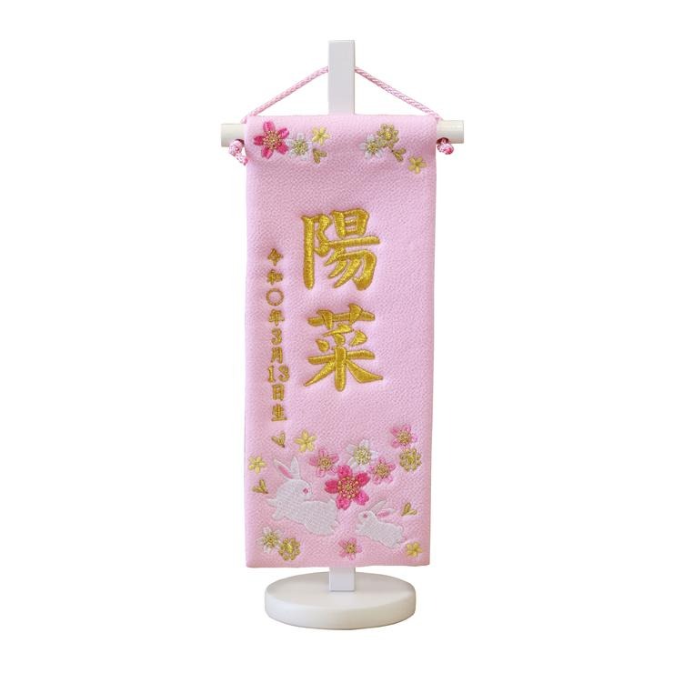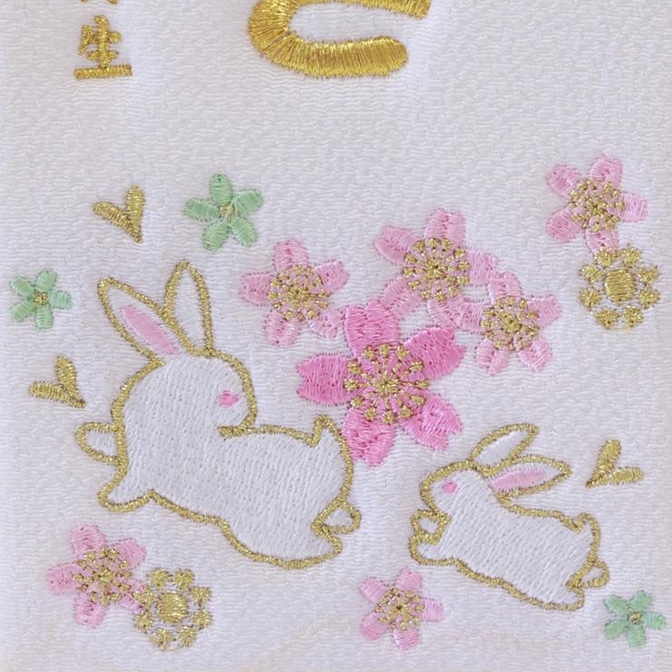 中央には、お子様のお名前と生年月日を、輝く金糸で丁寧に刺繍。愛らしいうさぎと桜の柄が、大切なお名前を華やかに彩ります。