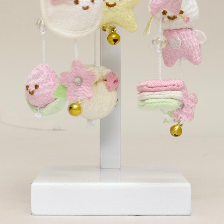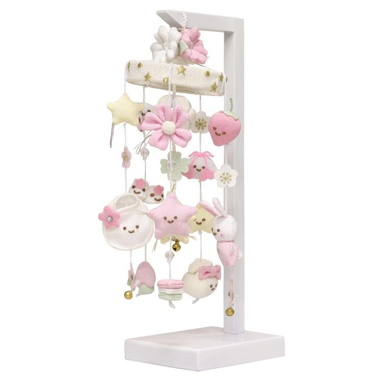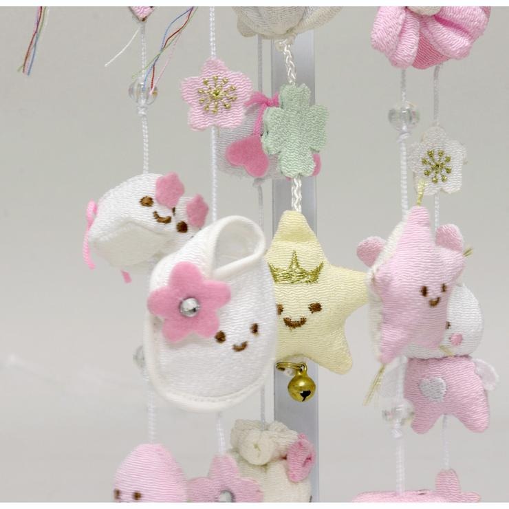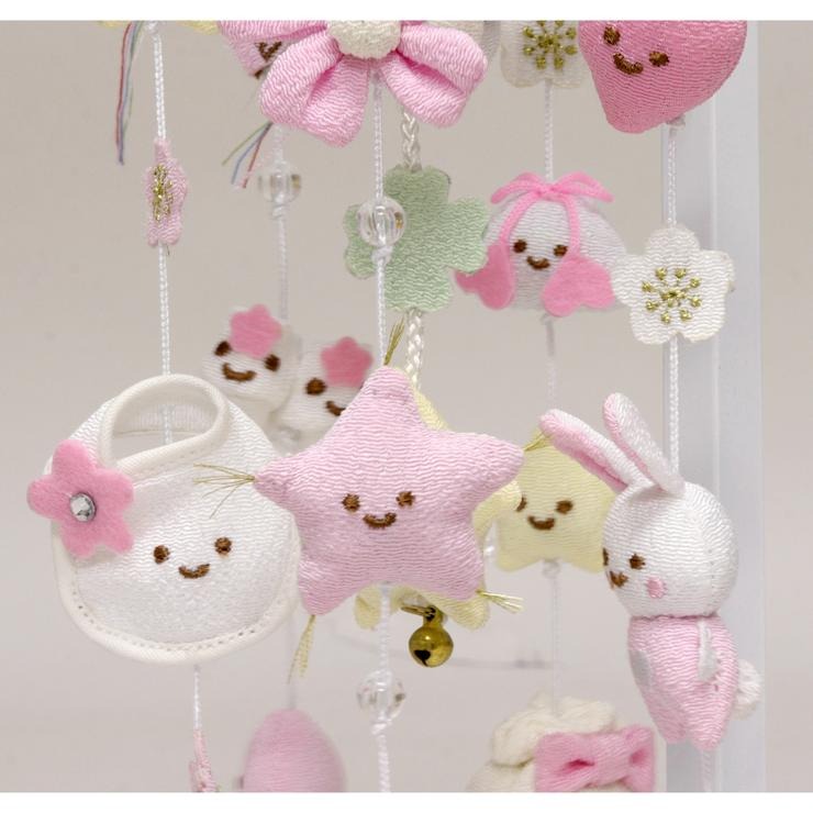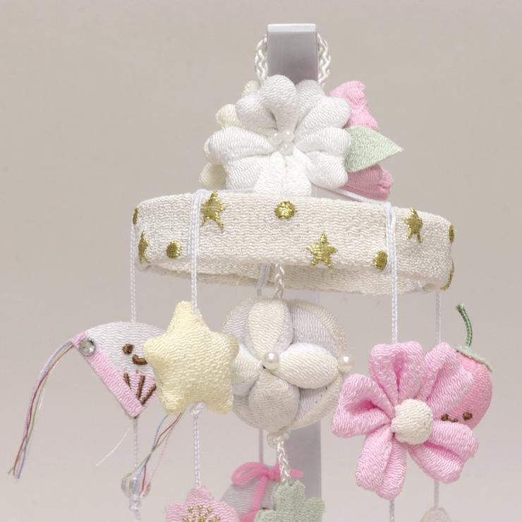 全体を優しい白とピンクで仕上げた、ちりめん細工の吊るし飾りです。