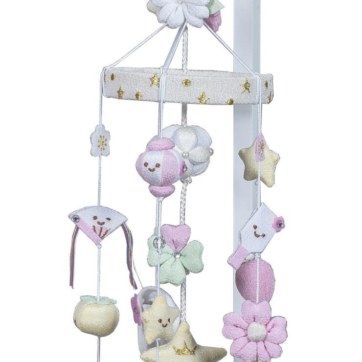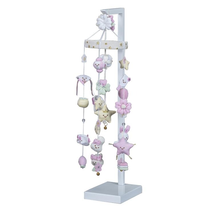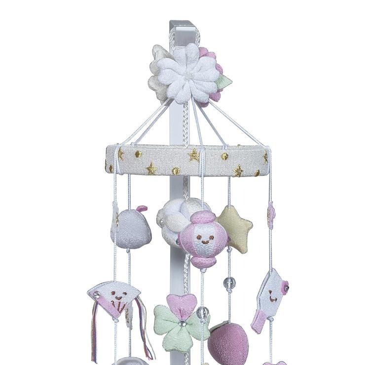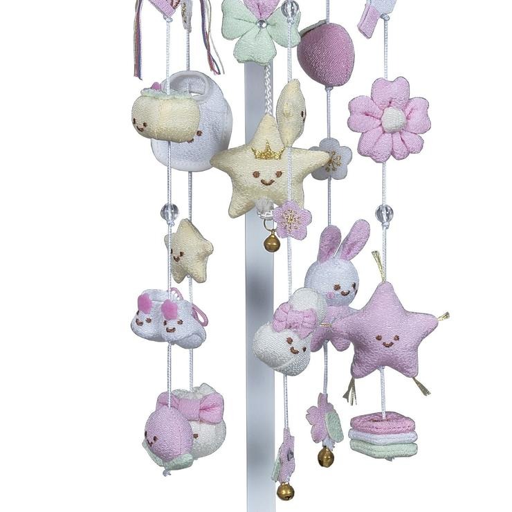 全体を優しい白とピンクで仕上げた、ちりめん細工の吊るし飾りです。