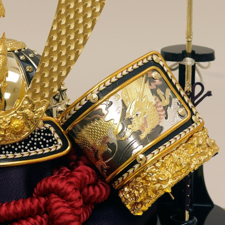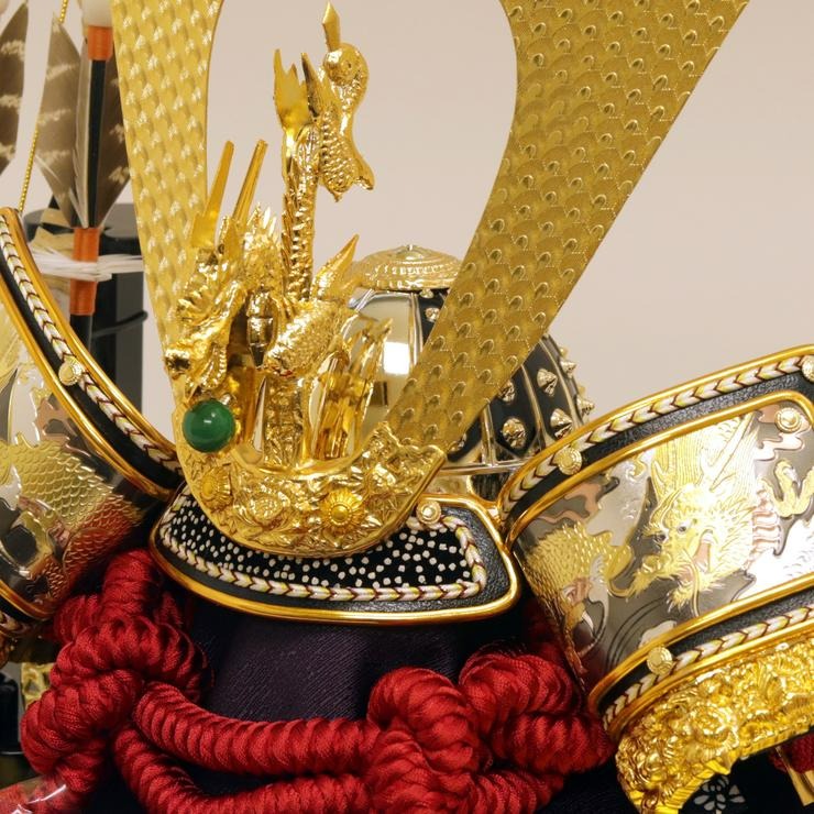 艶やかな黒塗りのケースに、力強い龍頭をあしらった黄金の兜が美しく映えるお飾りです。装飾を抑えたシンプルなデザインが、兜本来の気品と黄金の輝きを一層際立たせています。ケースには透明度に優れ、傷にも強いガラスを採用しているため、大切な兜をホコリから守り、その美しさを永く保ちます。