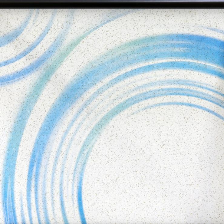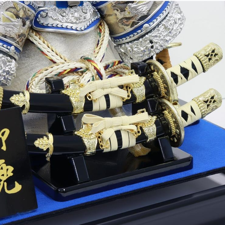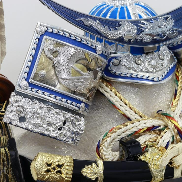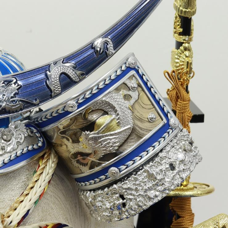 冴えわたる青と、洗練された銀の輝き、クールでスタイリッシュな兜飾りです。シャープな三日月の前立てには、龍の柄をあしらい、力強さの中に知性を感じさせます。背景のさざ波模様が、兜の持つ清らかな世界観を一層引き立てます。傷に強く透明度の高いガラスが、大切な兜を永く、美しい状態で保ちます。