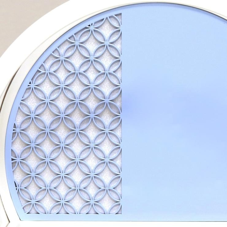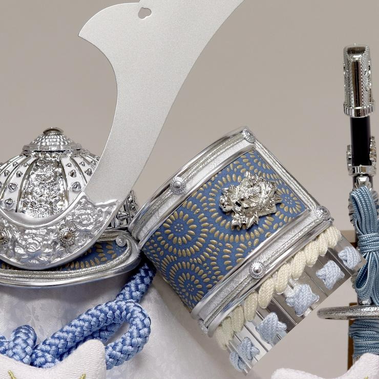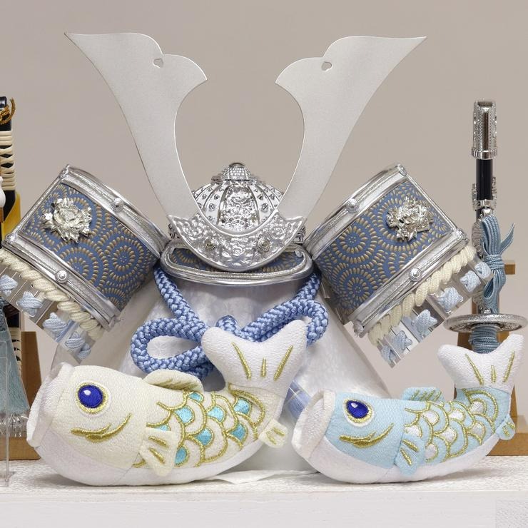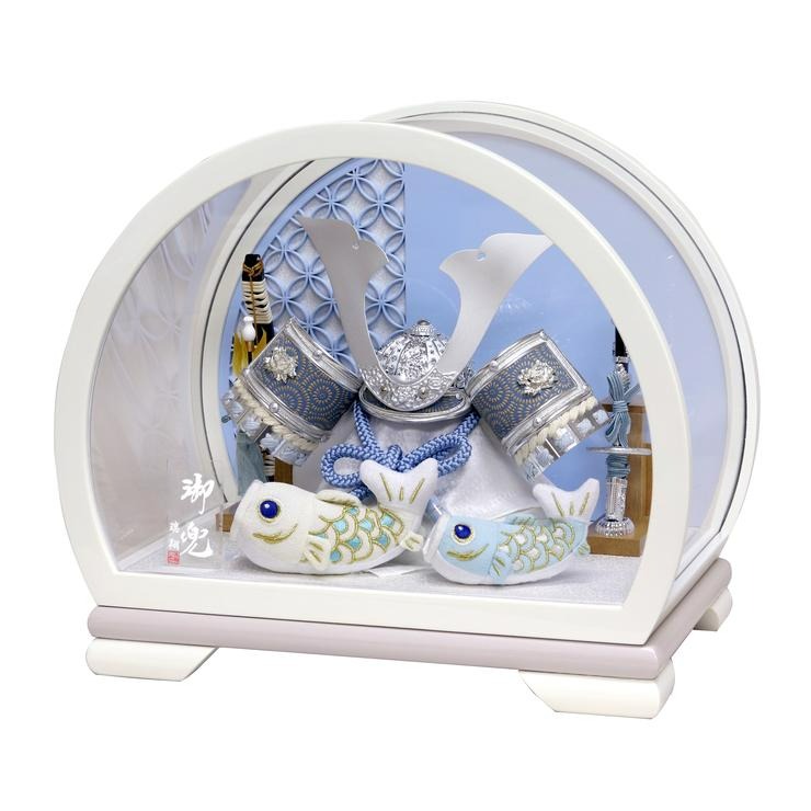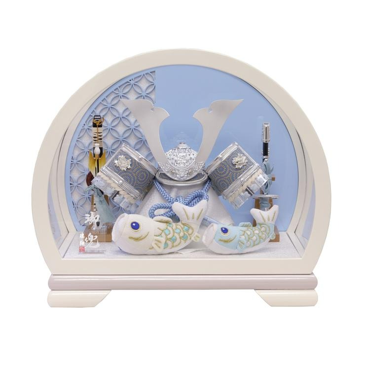 お節句を、もっと自由に、おしゃれに。リビングや子ども部屋のインテリアにすっと溶け込む、新しい形の兜飾りです。優しい白と、トレンドのグレージュで仕上げた半円形のケースは、家具とも相性抜群。爽やかな水色の背景に浮かぶ銀の兜が、洗練された印象を与えます。伝統的な七宝柄も、モダンな幾何学模様としてデザインにアクセントを加えています。軽くて持ち運びしやすいアクリルケースなので、飾り付けや収納も簡単。暮らしに寄り添うデザインで、お祝いの日をスタイリッシュに演出します。