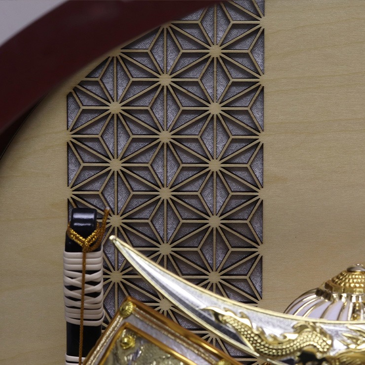 お部屋をモダンに彩る円形フレームの兜飾り。深みのある濃茶のケースが空間をぐっと引き締め、洋室・和室を問わず、洗練されたインテリアとして美しく調和します。背景には、お子様の健やかな成長を願う縁起の良い「麻の葉模様」をさりげなくデザイン。このシンプルな背景が、精緻な彫金を施した銀色の三日月兜の存在感を一層際立たせています。ケースは軽量で安全なアクリル仕様。デザイン性だけでなく、現代の暮らしに求められる扱いやすさも両立させました。