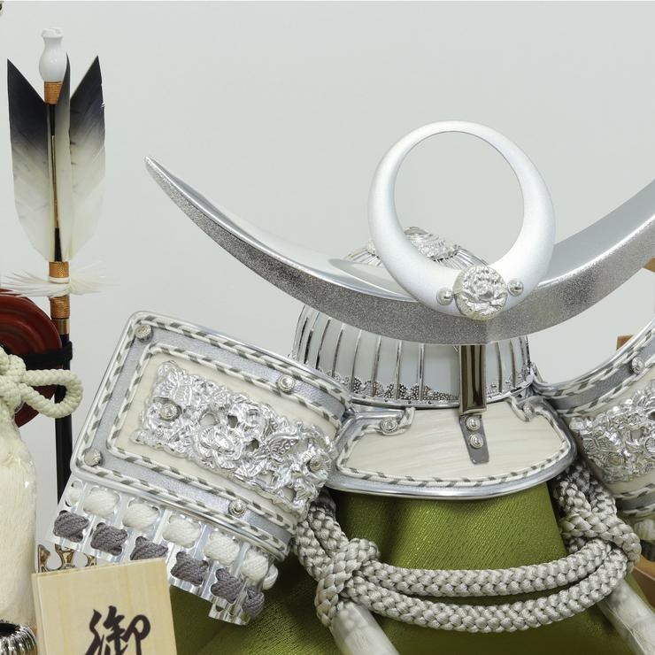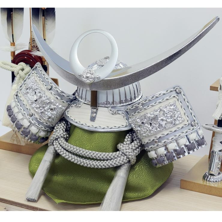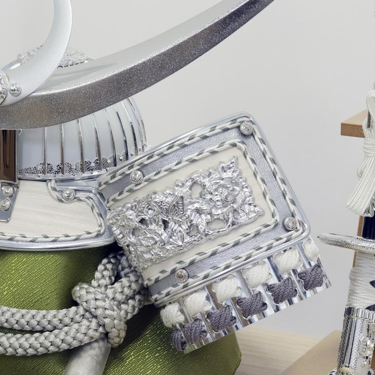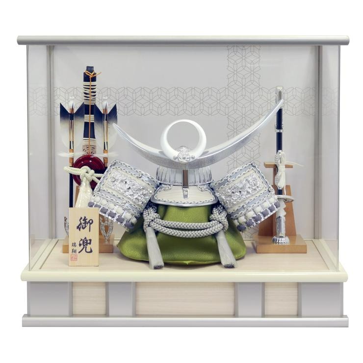 落ち着いた雰囲気のグレージュのケースに、シルバーを基調とした兜を合わせ、統一感のある上品なデザインに仕上げました。円が連鎖する幾何学的な文様で「円満」「調和」「ご縁」などの願いが込められた、七宝柄背景と合わせています。ケースは軽量で安全なアクリル仕様のため、持ち運びやお手入れが簡単で、現代の暮らしに寄り添う一品です。