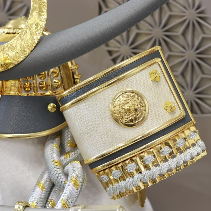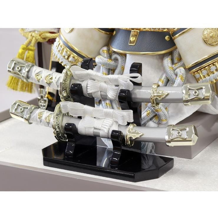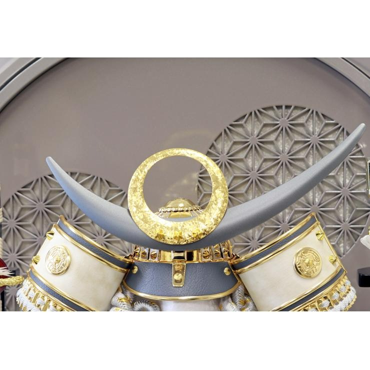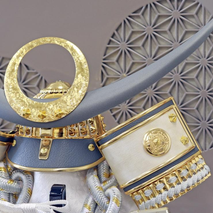 背景に広がる「麻の葉模様」は、お子様のまっすぐで健やかな成長を願う、古くからの縁起の良い柄。華やかな金の日輪兜はネイビーと水色の差し色がクールな印象を演出します。これらの伝統的な願いを、洗練されたグレーの円形ケースが優しく包み込みます。銀色に輝く二本の太刀は、お子様を災いから守る大切なお守り。デザイン性だけでなく、軽くて割れにくいアクリルケースを採用しており、現代の暮らしにもスマートにフィットする一品です。