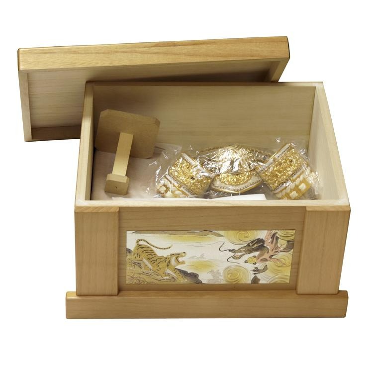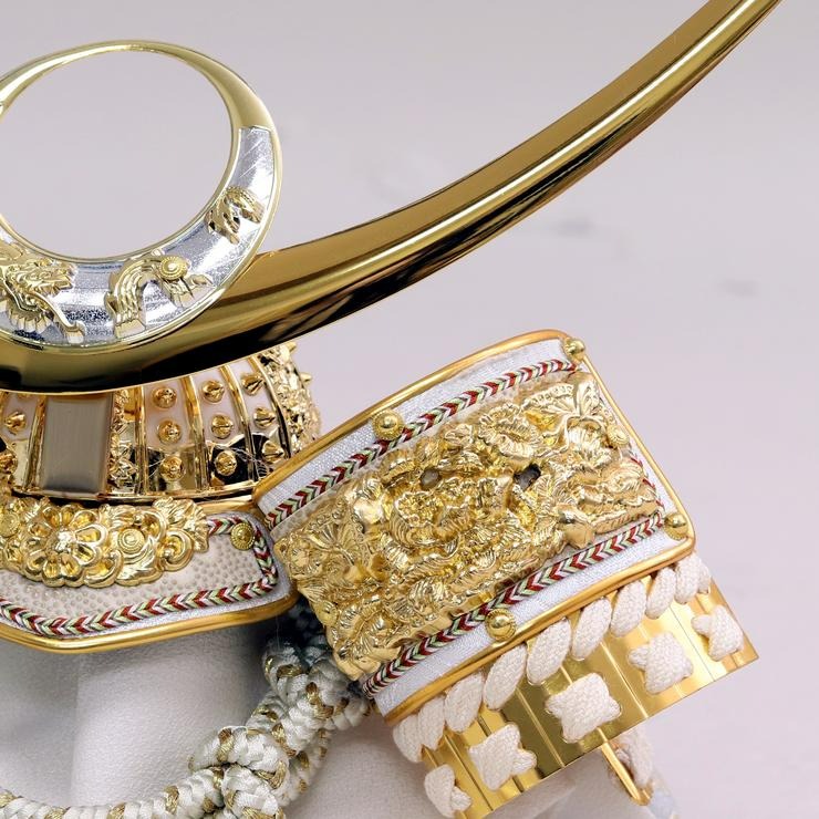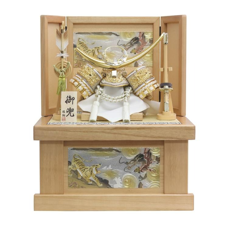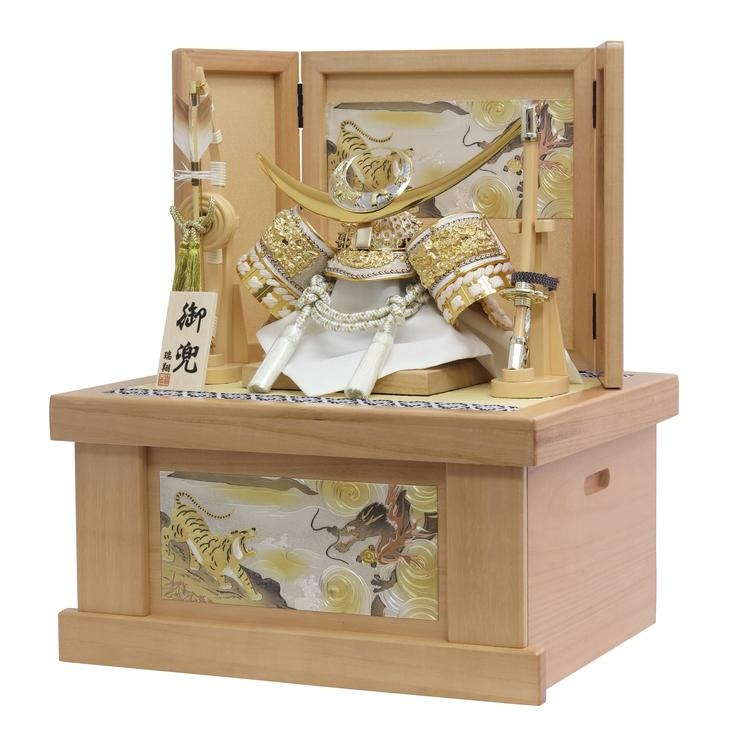 ナチュラルな木目の風合いが、どんなお部屋にも優しく馴染む兜収納飾りです。屏風を開くと現れるのは、お子様の成長を見守る、力強い龍虎の彫金。上品な白と金を基調とした兜は、お部屋に圧迫感を与えず、明るい雰囲気を演出します。お節句が終われば、兜や弓太刀はすべて飾り台の中にすっきりと収納可能。デザイン性と、現代の暮らしに求められる扱いやすさを両立させた、贈り物にも喜ばれる一品です。