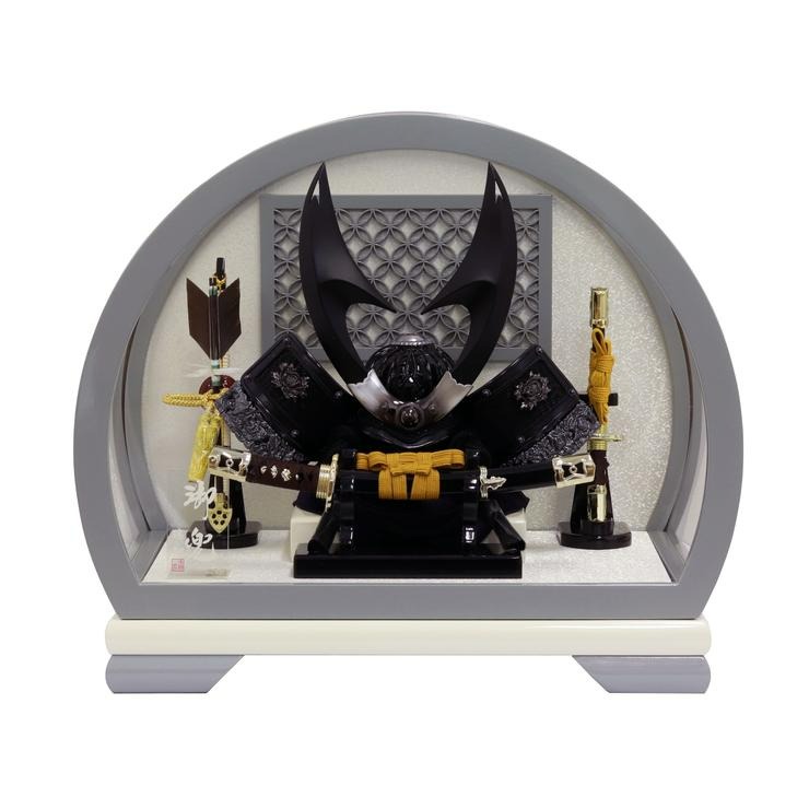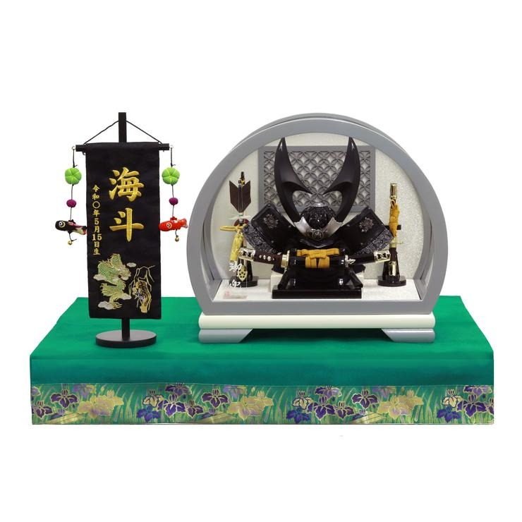クールでモダンな兜飾りセット。アートオブジェのような半円形のケースに、漆黒の兜が静かな存在感を放ちます。お子様のお名前と龍虎柄の刺繍が施されたお名前旗、場を格調高く引き締める菖蒲柄の敷物まで、この一台で素敵なコーディネートが完成。伝統的なお祝いを、現代のインテリアに美しく調和させたいご家庭にぴったりの一揃いです。