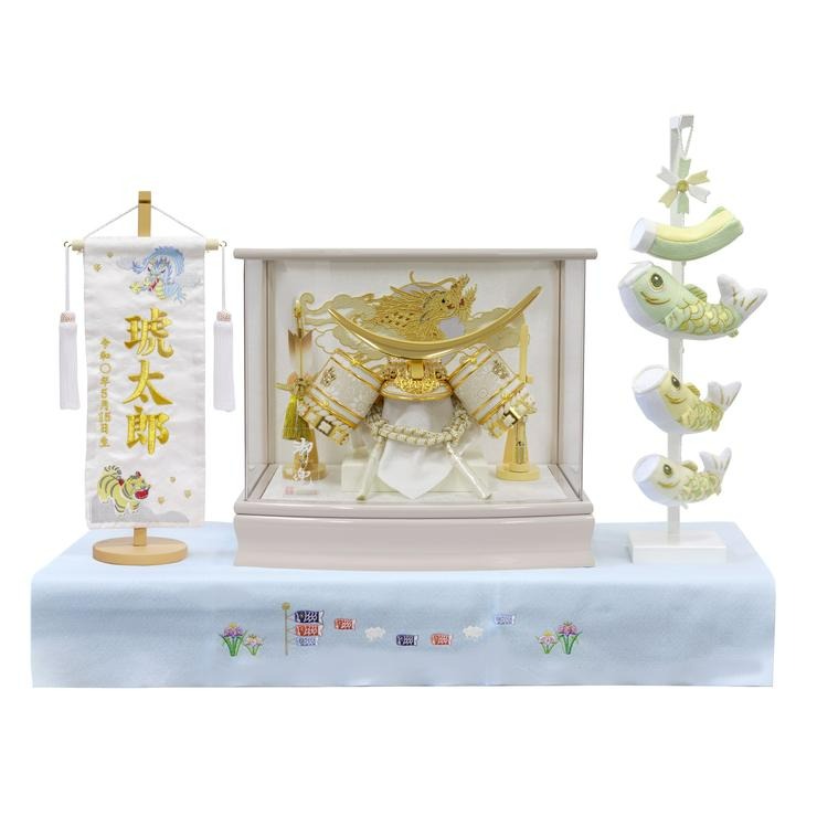 お子様の初節句を優しく、そして盛大に彩るアイテムが揃った兜飾りセットです。白と金を基調とした上品な兜飾りに、龍と虎の可愛らしいイラスト刺繍が入ったお名前旗、そしてちりめん細工の鯉のぼりまで。一つひとつのアイテムが、お子様への「おめでとう」の気持ちを伝えます。鯉柄の刺繍入の淡いブルーの敷物を敷けば、夢いっぱいの温かいお祝い空間が完成します。