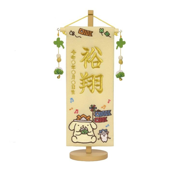 ポムポムプリンとなかまたちが、お子様の誕生をお祝い!かぶとをかぶったプリンとマフィンが、元気な歌と演奏で端午の節句をもりあげます。金糸で刺繍された大切なお名前の周りには、幸運を運ぶ四つ葉のクローバーと、立身出世を願う鯉のぼり。兜をかぶったプリンの姿が、あらゆる災いからお子様を優しく守ってくれる、お守りのようなお名前旗です。