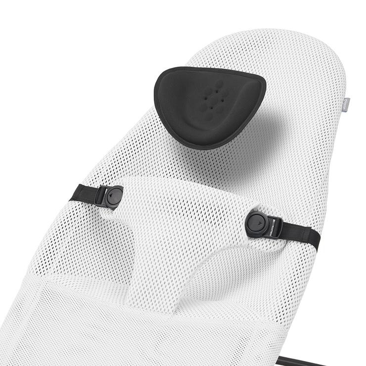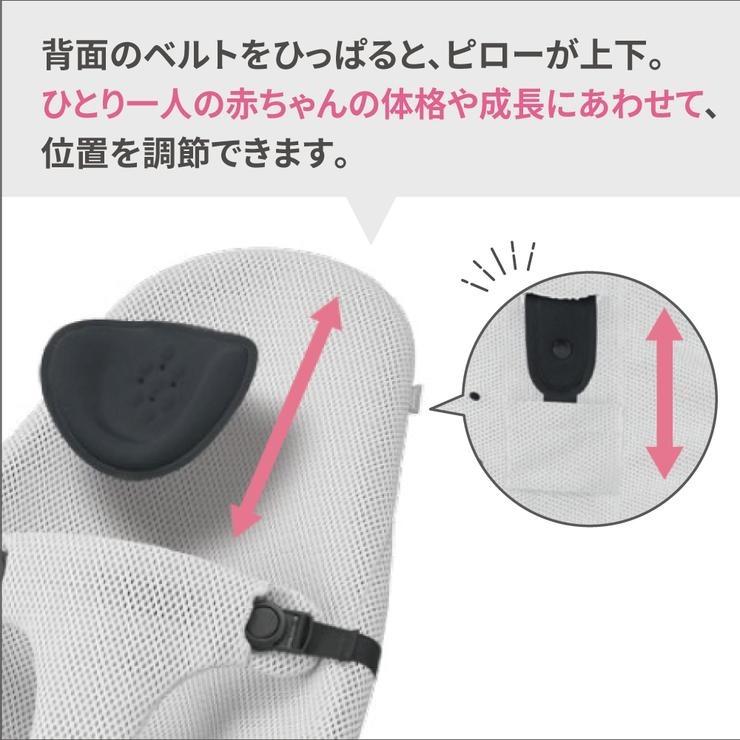 シートの内側に内蔵されているので、外側からは見えません。背面のベルトをひっぱると、ピローが上下。ひとり一人の赤ちゃんの体格や成長にあわせて、位置を調節できます。