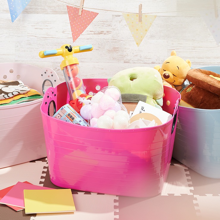 キャラクターモチーフの持ち手がかわいい大容量バケツ!おもちゃ箱やランドリーバケツとして、水濡れOKなのでレジャーや水遊び場に持っていくのも最適です。