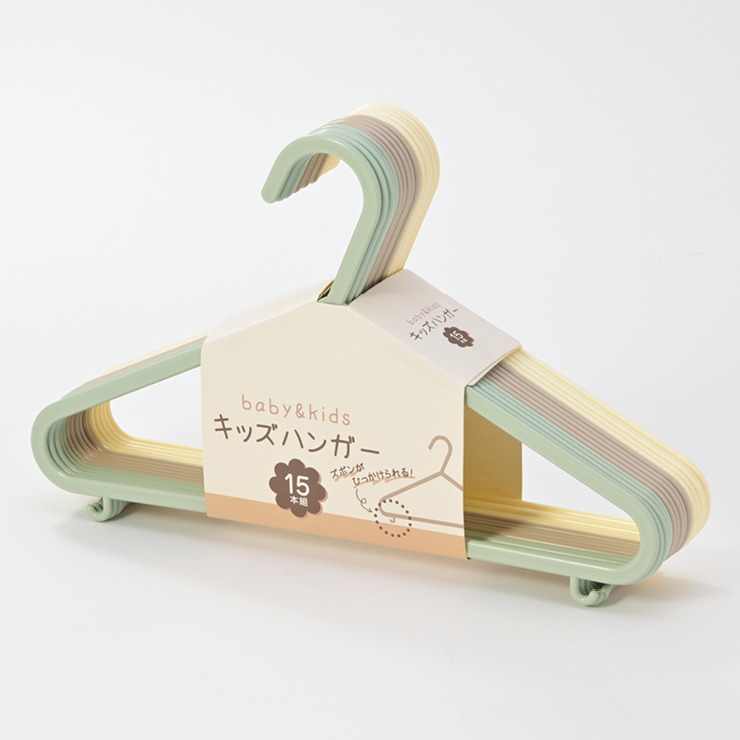 ズボンがひっかけられるフック付きキッズサイズのハンガー。