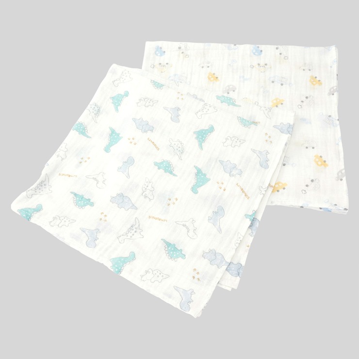 「恐竜柄とくるま柄」の2枚組ガーゼブランケットです。