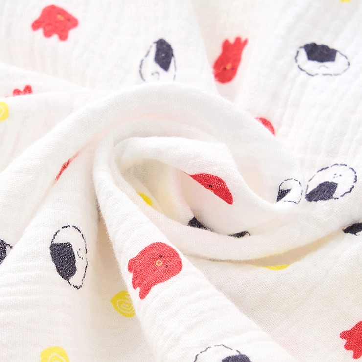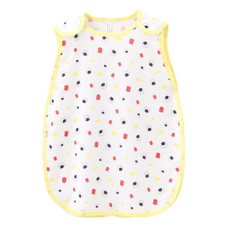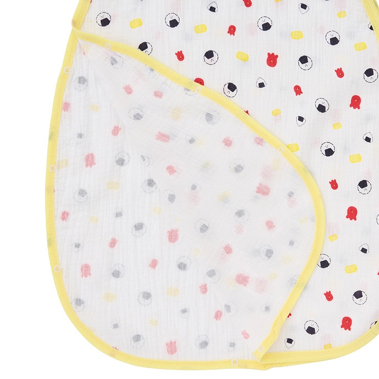 柔らかい素材のガーゼ素材 で 本体カラーが白色に可愛いプリントが映えて 周りのカラーバランスがアクセントの商品となります。