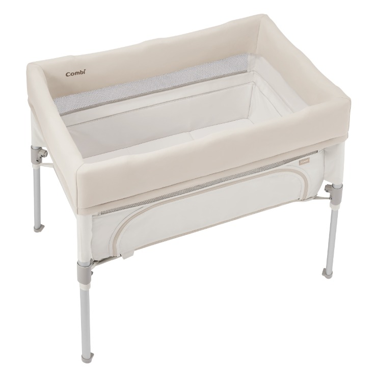使用シーンに合わせて高さが2段階調節できるベビーベッド。