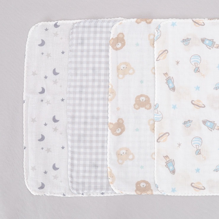 顔などの汗のふき取り、赤ちゃんの沐浴時、食事のエプロンがわりや口のふき取りなどいろいろな用途でご使用いただけます。
